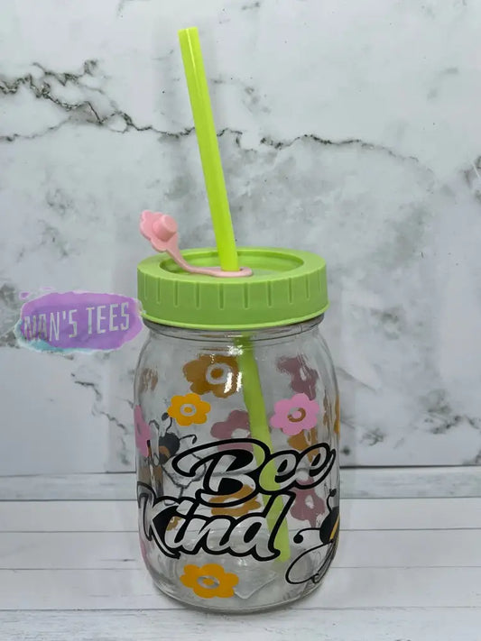 Bee Kind 16 oz Glass Jars with Color Lid and Straw