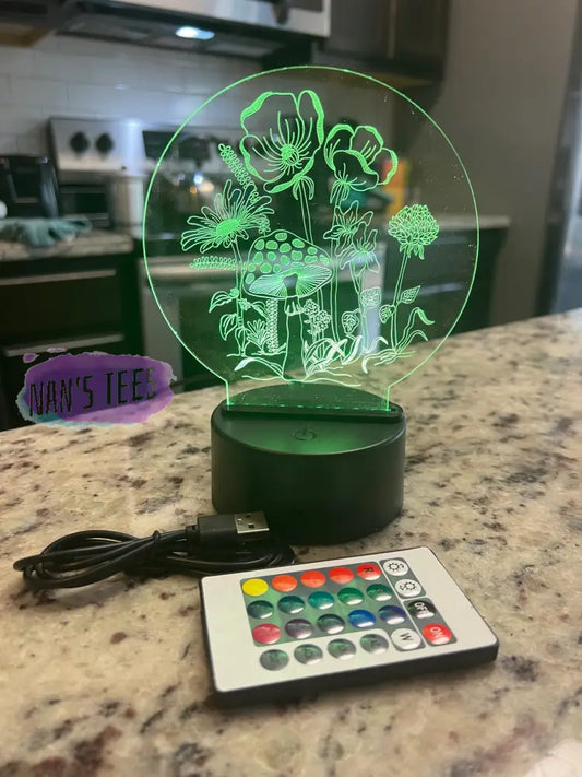 Mushrooms Engraved Clear Acrylic 3D LED Night Light with Base and Remote