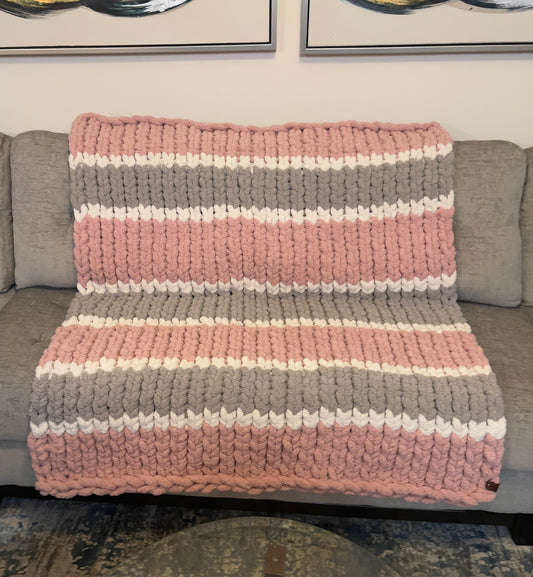 Custom Hand-Knit Chunky Throw Blanket | Pink, White & Light Gray | Ultra Soft & Cozy