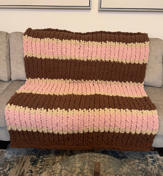 Custom Hand-Knit Chunky Throw Blanket | Brown, Beige & Pink | Ultra Soft & Cozy