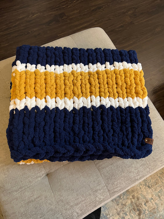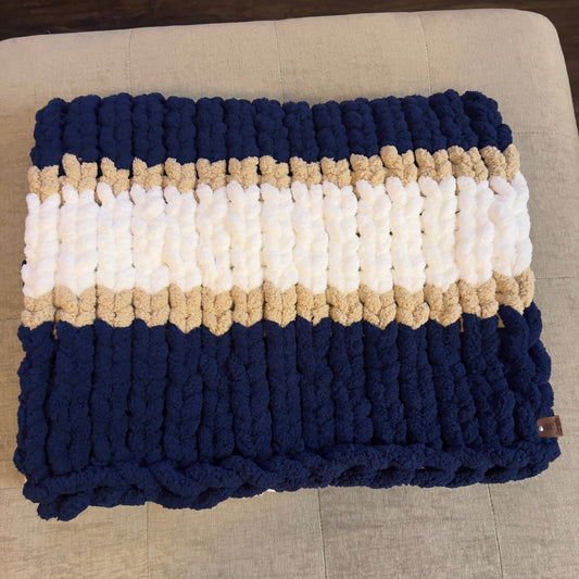 Custom Hand-Knit Chunky Throw Blanket | Navy, White & Gold | Ultra Soft & Cozy