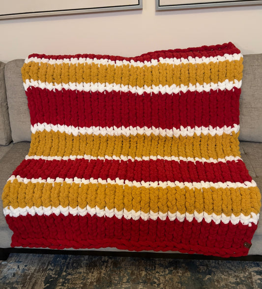 Custom Hand-Knit Chunky Throw Blanket | Red, White & Gold | Ultra Soft & Cozy